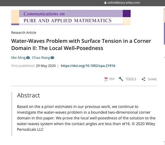 近日,必一运动明梅副教授与合作者的论文“Water waves problem with surface tension in a corner domain II: the local well-posedness”在国际顶尖数学期刊Communications on Pure and Applied Mathematics(CPAM)上在线发表。CPAM由国际最负盛名的应用数学研究所之一—柯朗数学科学研究所(Courant Institute of Mathematical Sciences)于1948年创刊,发表纯粹与应用数学、数学物理等研究领域具有突破性的一流研究成果。该杂志每年刊载不到百篇论文,在数学界有极高的知名度和影响力,属于数学类最顶尖的期刊之一。例如,CPAM曾在2013年被ISI Journal Citation Reports评价为302种入选数学类刊物第一名。