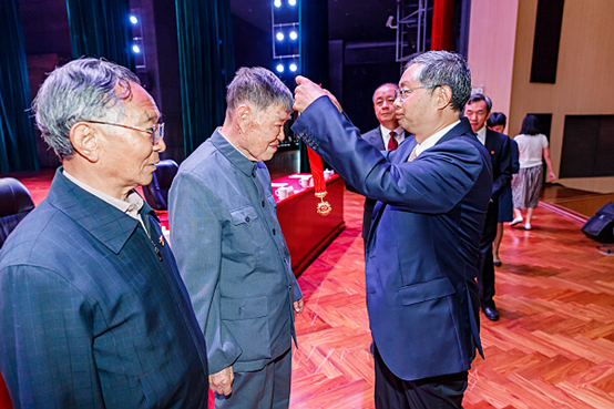 公司退休教师王学仁(原必一运动体育公司董事长)接受必一运动体育公司党委书记林文勋同志颁发“光荣在党50年”纪念章