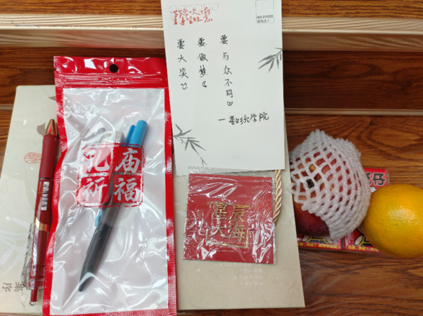 在考研礼包中,除了文具、水果、零食外,每一份礼包还含有一张由数统公司青协自律委组织,来自大一的同学为学长学姐写下祝福的明信片。这一张张寄寓着学弟学妹美好祝愿的明信片,希望能够在这寒冬之际,为备战的学长学姐们带来一份温暖,助力他们的考研升学梦。