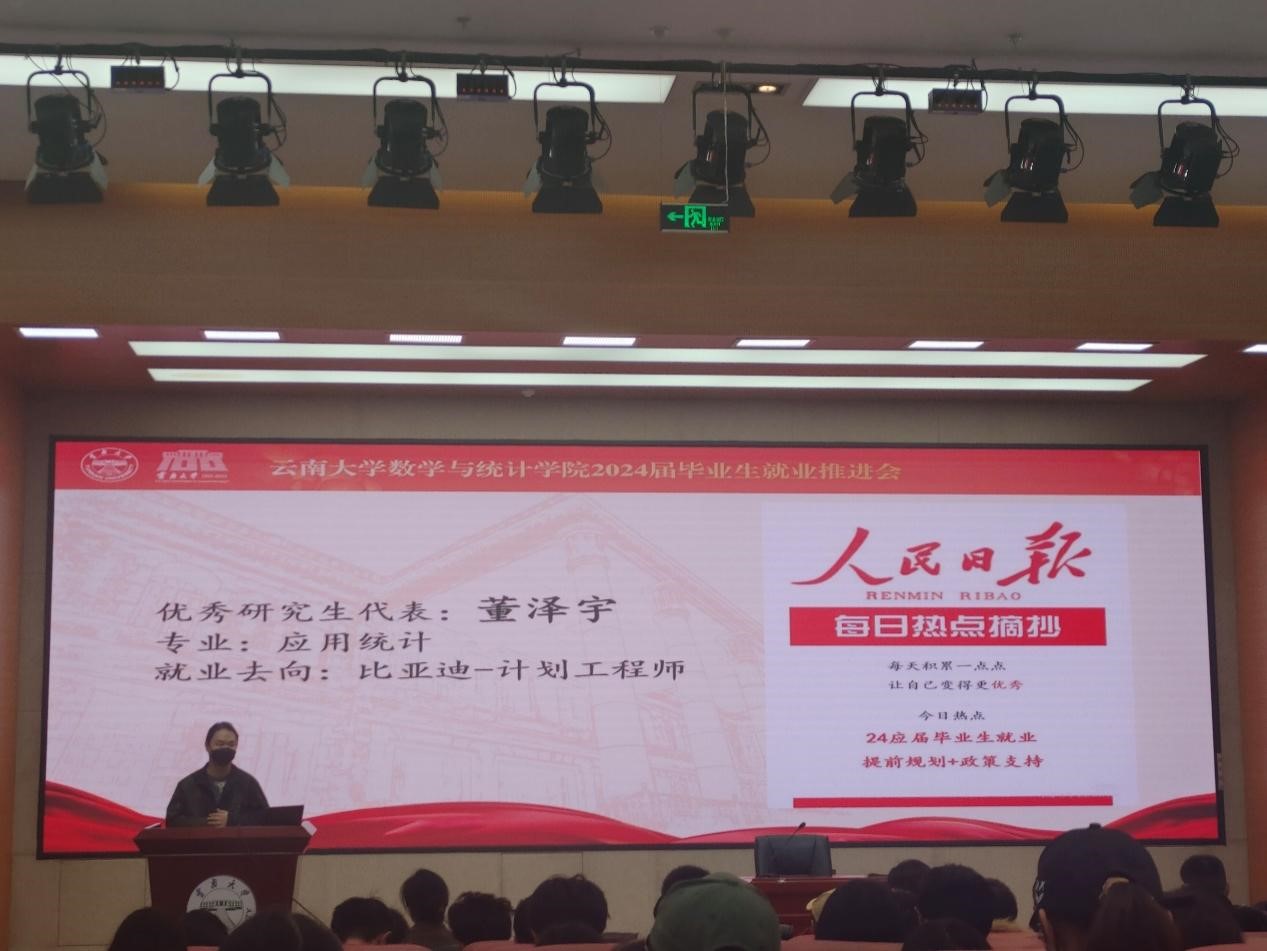 优秀研究生代表董泽宇学长来自应用统计专业,就业去向为比亚迪-计划工程师。董学长给我们强调了工作适配度的重要性,找工作前关注招聘机关官方公众号、网站的信息,分析与自己适配的工作。