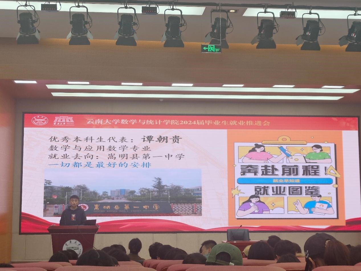 优秀本科生代表谭朝贵学长来自数学与应用数学专业,就业去向为嵩明县第一中学。谭学长给我们分享了面试教师岗位时自身的体会与经验。面试前做好准备,多次练习讲课;面试时注重逻辑,暂时给不出回答时可以征询面试官意见争取思考时间,给面试官留下好印象。最后学长祝福各位学子:但行好事,莫问前程,一切都是最好的安排。
