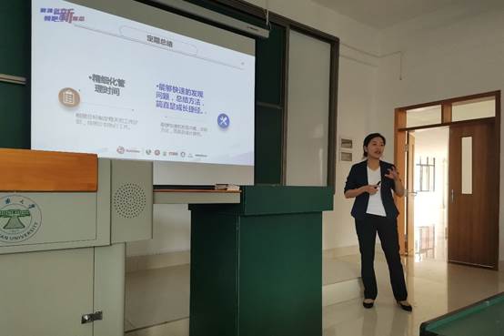 首先展开分享的是现任百胜餐饮(云南)区经理的杨永竹老师,她从“自我认知”“提升自己”“定期总结”三个方面,并结合自己从大学毕业以来的工作实际向在场员工阐述了自己的职业发展之路,在最后一部分突出强调了精细化管理时间和能够快速发现问题、总结方法的重要性,告诉在场员工不断提升自己的唯一途径就是不断学习。