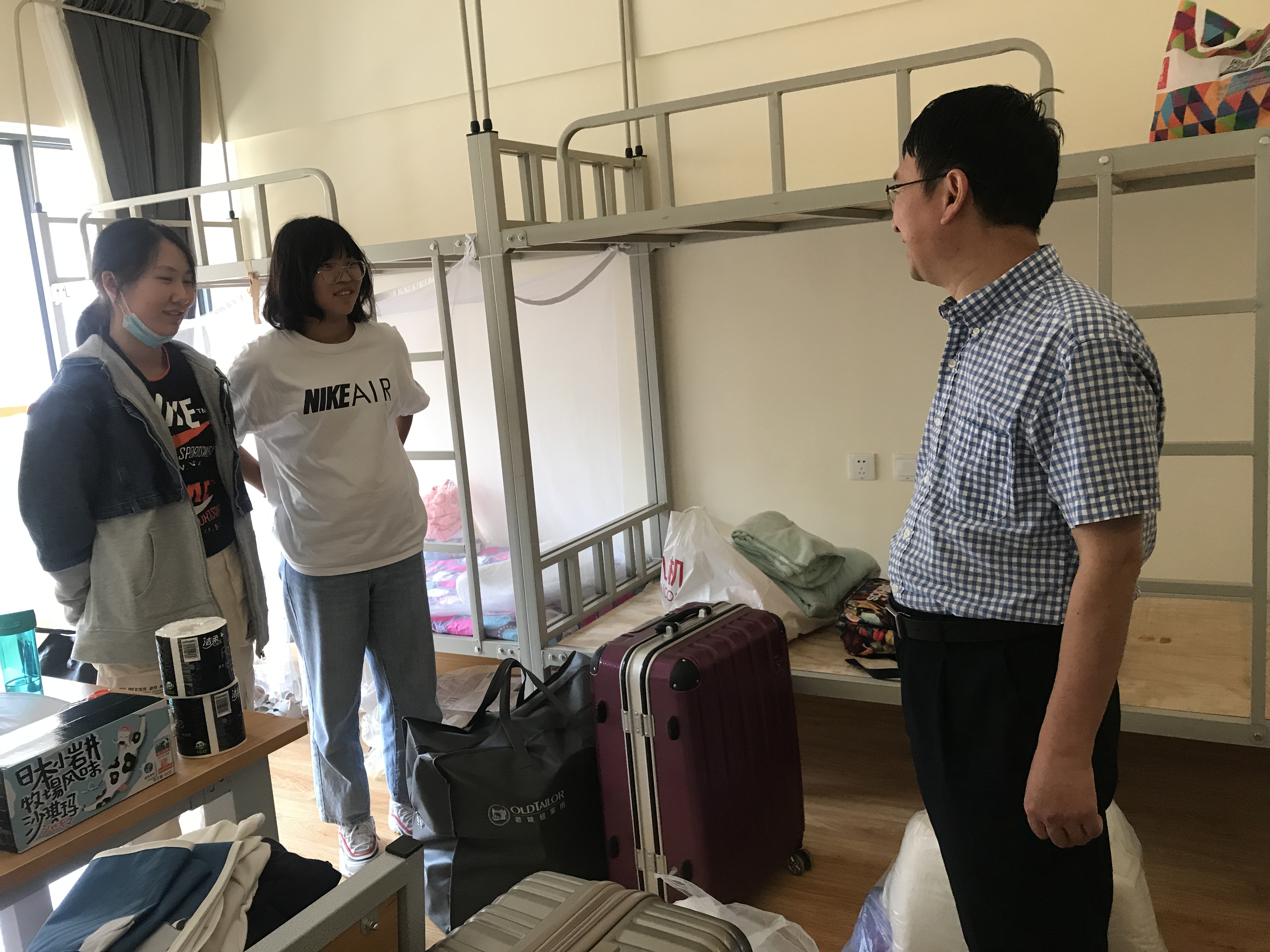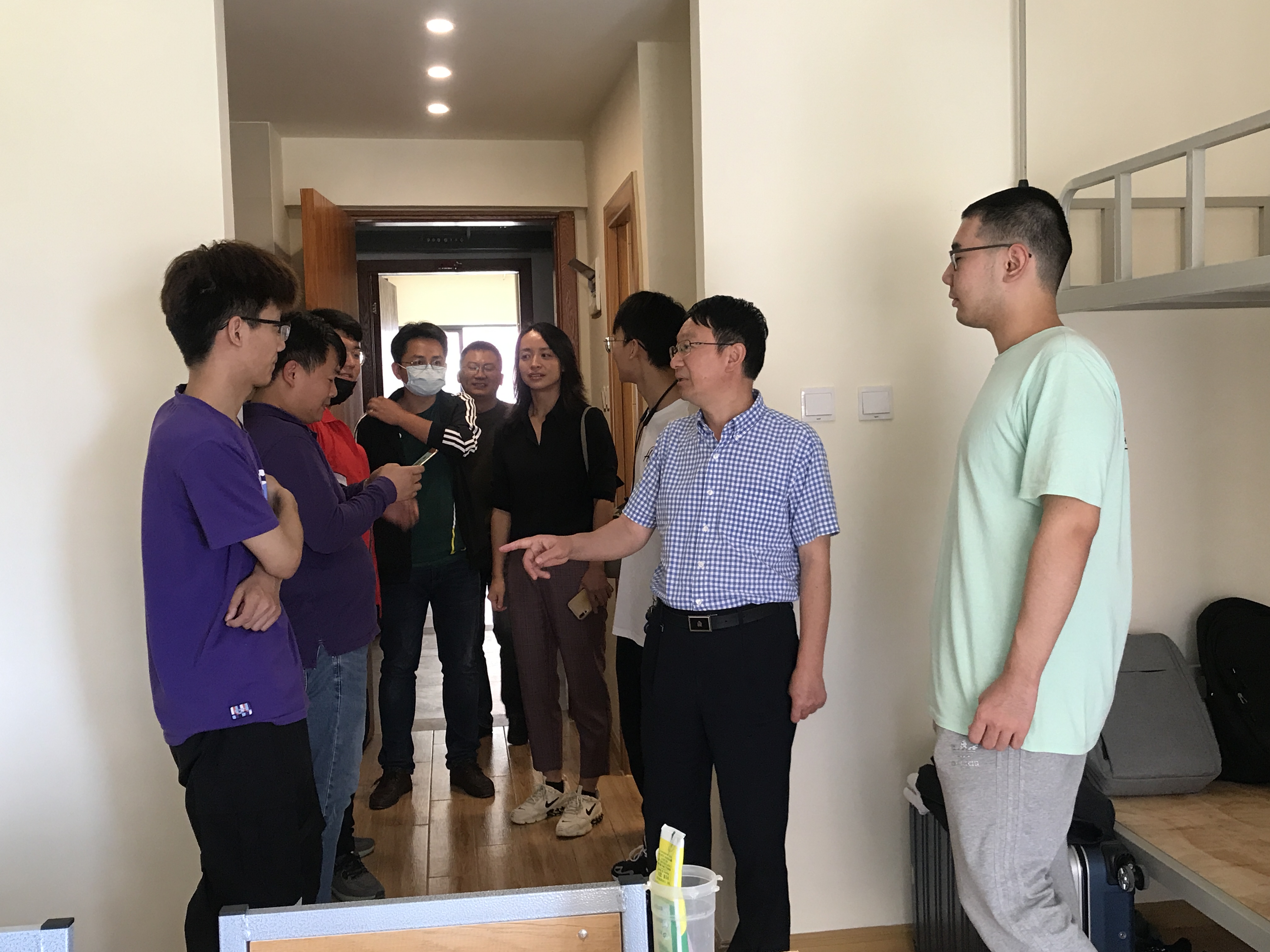 10日下午,必一运动经理唐年胜,党委副书记杜芳芳,副经理潘东东,2020级本科生辅导员鲁学伟,2020级班主任李朝迁、刘进静来到员工宿舍看望新生。鼓励同学们认真学好专业,取得优异成绩。