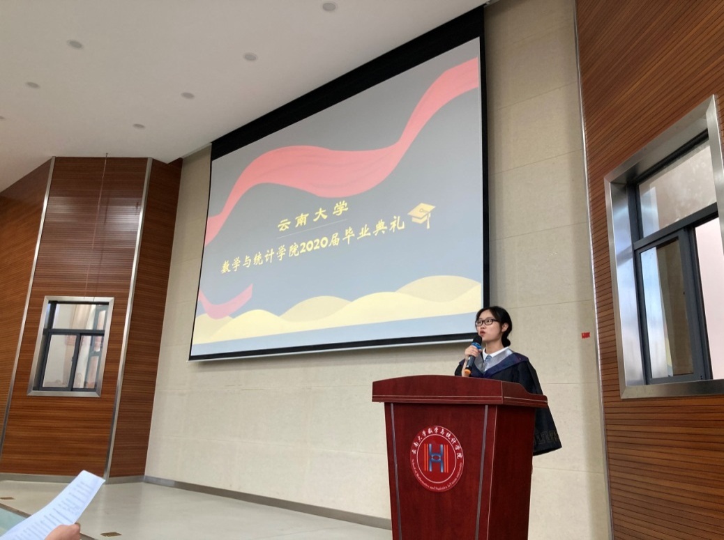 毕业生代表刘孟含和孙雪先后上台发言,她们回顾了自己在云大的岁月,表达了对时光稍纵即逝的惋惜,以及对同窗、老师和公司的感激与不舍。同时鼓励毕业生们人生没有终点,面对荆棘丛林勇往直前,面对鲜花掌声不卑不亢,并祝福每一位师生的未来都能更加灿烂美好。