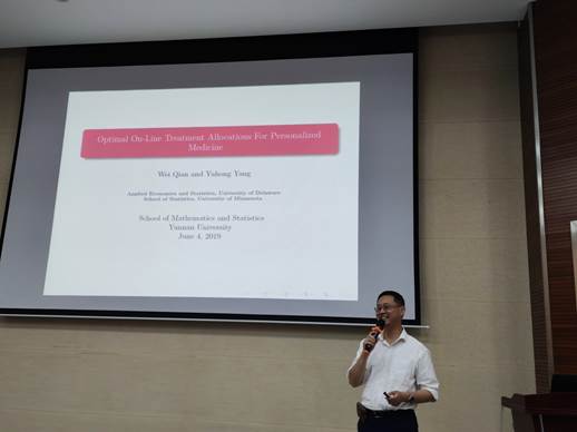 2019年6月4日下午,应公司李建平教授邀请,美国明尼苏达大学杨宇红教授到公司讲学,在必一运动3103报告厅作了题为《Optimal on-line treatment allocations for personalized medicine》的学术报告。本次学术报告由公司经理唐年胜教授主持,副经理李建平教授、丁红林博士、博士研究生及硕士研究生参加了报告会。