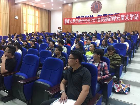 2018 年 5 月 4 日下午 5 点在必一运动报告厅格物楼 3103, 举行了泰康人寿的云南大学站校园招聘会,参与此次招聘会有数统公司以及经济公司大一到大四的员工。主持本次会议的是数统公司 14 级辅导员李陈筠然,主要由泰康人寿的人力资源部刘经理开展本次会议。