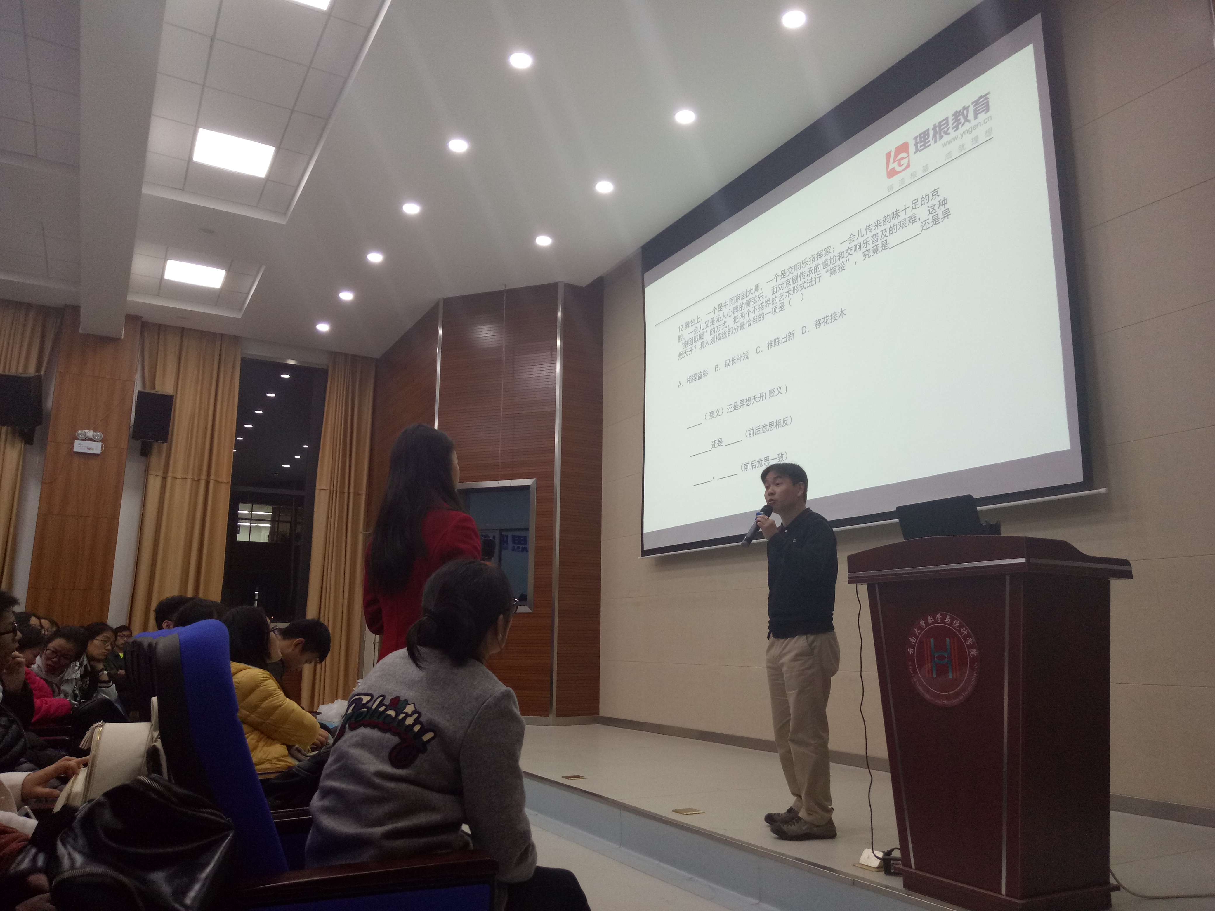 韩震老师首先表示,就业方向有多种,无论哪种,有其光鲜亮丽的一面,自然也有其不为人知的辛酸。而公务员是其中的一种选择方向,对于广大老员工来说,也不失为一种不错的选择。那么如何在千军万马过独木桥的公务员考试中让自己取得满意的成绩?接下来,韩震老师便给同学们讲解及分析了一些最新国考及省考中的真题,用实际的例子来让大家能更快地体会和吸收老师所传达的知识技巧。演讲过程中,韩震老师引经据典,幽默大方,引得同学们聚精会神,虚心学习。讲座最后,台下有同学主动向韩老师提出困惑,韩老师也耐心地为大家一一解答。韩老师希望大家在选择公务员作为就业方向之后,能掌握正确、高效的方法,有针对性的进行训练,并谦虚地表示希望自己的演讲能给同学们带来帮助。