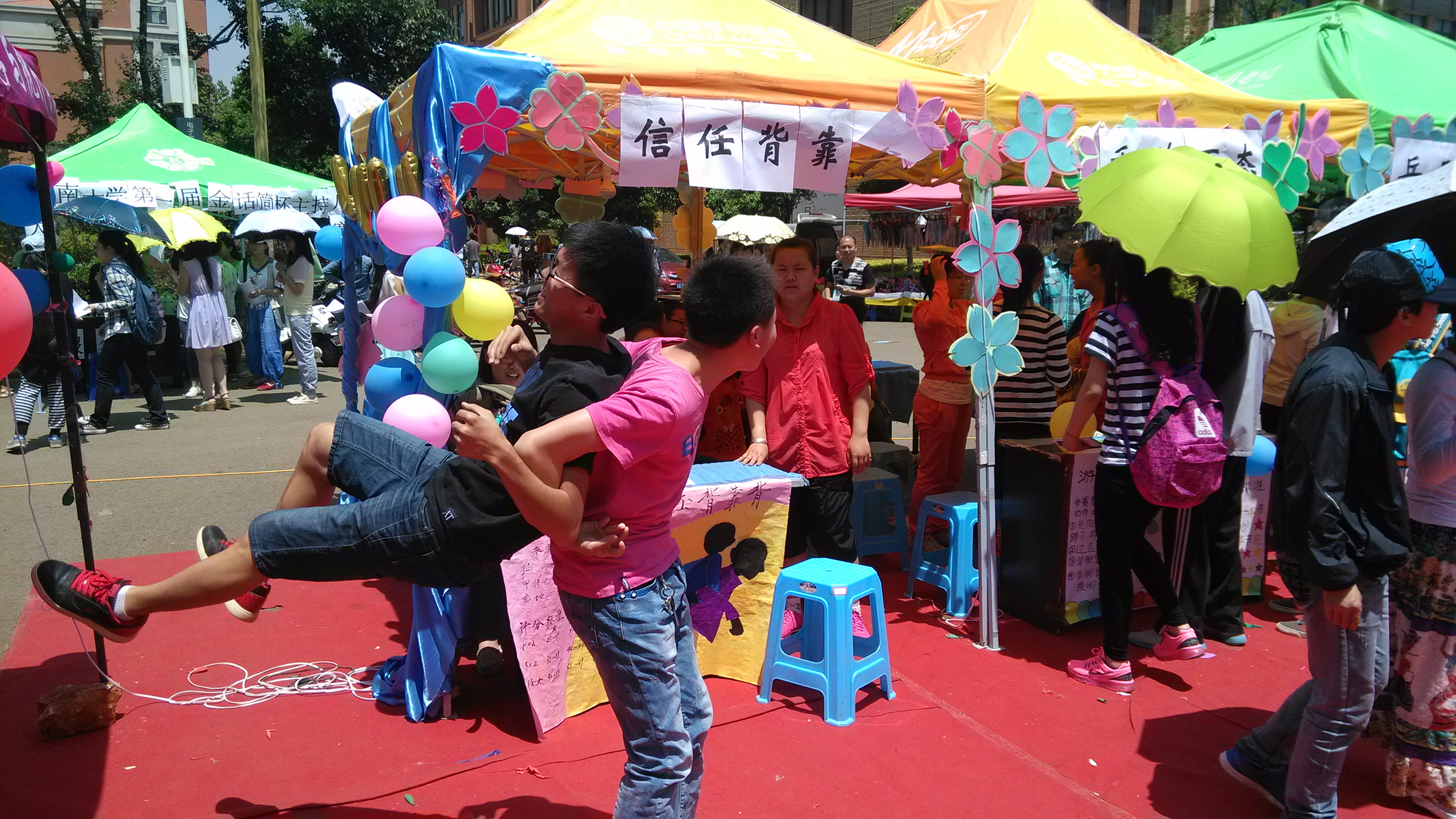 上午九点,公司同学们就开始聚集摆点,为中午游园会的正式开始做准备活动。中午十一点多,各专业在楠苑食堂外面的摊点---信任背靠背,千姿百态,乒乓夹夹乐,多多衣善,穿针引线和疯狂叠叠乐六个活动率先开始,不少下课的同学都参与了游戏,并赢得了属于自己的奖品。