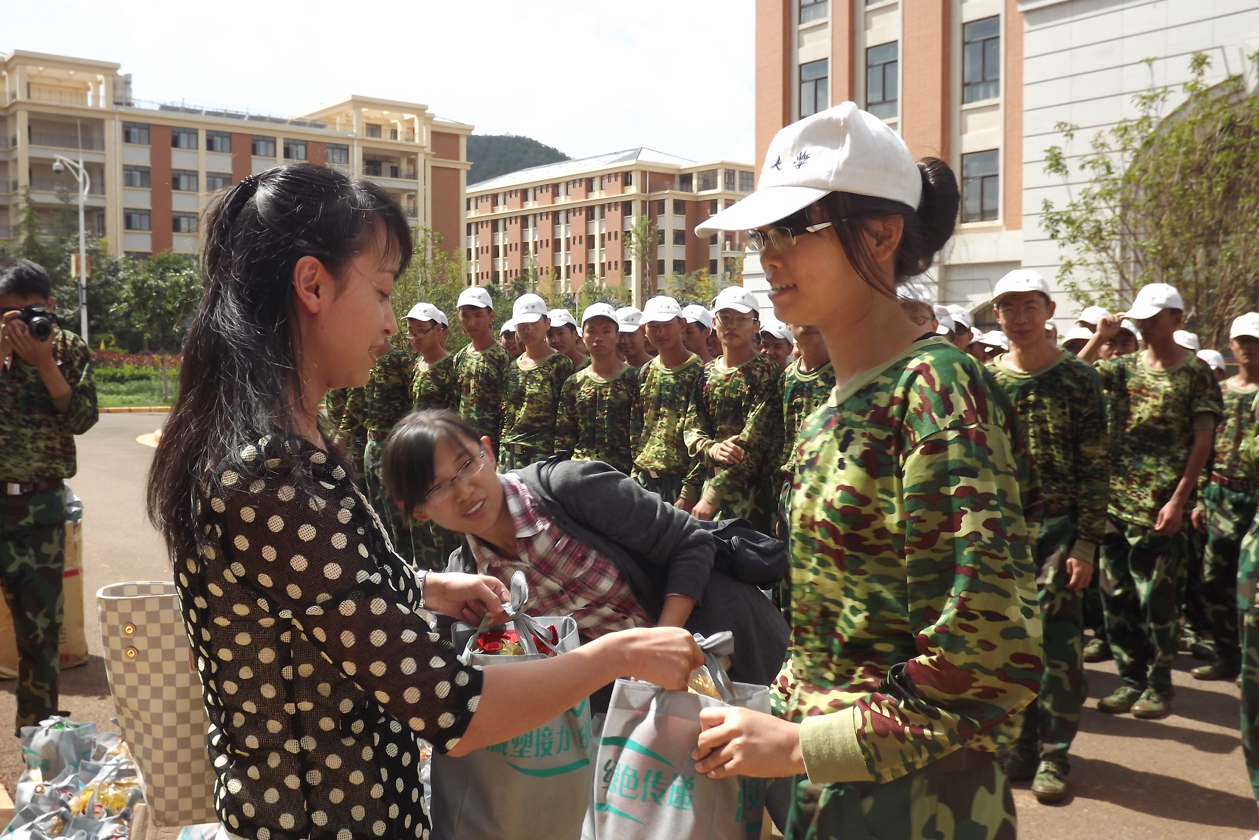 2012年9月10号上午,公司领导在呈贡校区格物楼3栋前对数统公司参加军训的2012级本科生同学进行了亲切的慰问。公司党委副书记杜芳芳老师对同学们的精神风貌给与了肯定;同时提醒同学们注重锻炼的同时也应该保护好自己的身体,以崭新的姿态迎接未来的老员工活。随后,慰问的领导为同学统一发放了慰问品,2012级的全体同学深切地感受到了在这个大家庭中的温暖,懂得了公司领导对同学的真切关怀与呵护,在未来几天的军训路途中,大家会更加满怀激情,奋勇向前。
