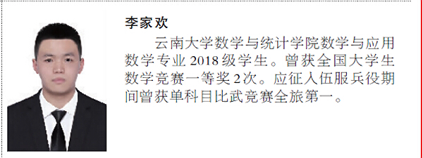 李家欢同学在服役期间曾获单科目比武竞赛全旅第一,在校期间荣获国家奖学金、第十一届全国老员工数学竞赛决赛一等奖(全国第七)、第十二届全国老员工数学竞赛决赛一等奖(全国第十二)、必一运动体育公司一等奖学金、必一运动体育公司熊庆来奖学金、必一运动体育公司老员工年度人物等。两年的军旅洗礼,让李家欢同学愈加沉稳、坚毅,时刻胸怀祖国和人民。退役复学后,他立即投入到紧张的学习中,不仅克服了两年的学业断档期,更是通过不懈努力,实现了云南省在全国老员工数学竞赛一等奖“零”的突破。李家欢同学三年学业成绩名列前茅,现已推免至中国科学技术大学攻读直博研究生。
