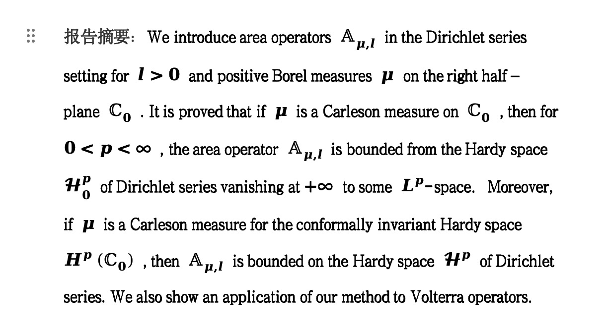 报告人简介:王茂发,武汉大学必一运动教授,博士生导师,武汉大学必一运动副经理,全国泛函分析空间理论学术委员会成员、现代分析数学及其应用学术委员会成员,主要研究领域为泛函分析及其应用、函数空间上的算子理论,先后承担国家自然科学重点项目、面上项目等多项,在 J. Funct. Anal., J. Operator Theory, Math. Z., Indiana Univ. Math. J., Sci. China Math. 等期刊上发表学术论文一百余篇。